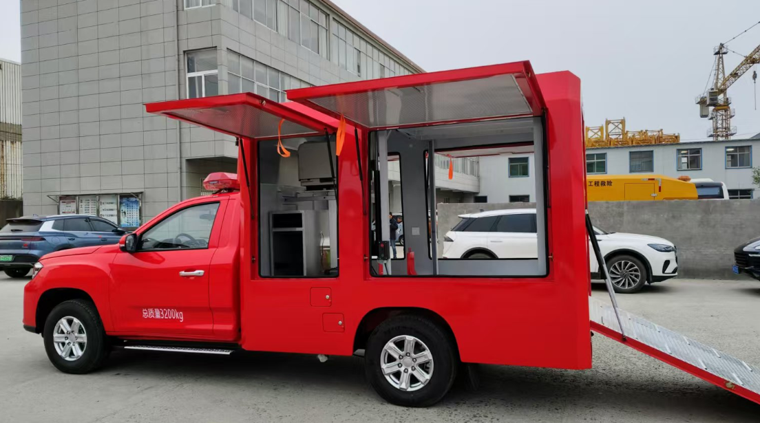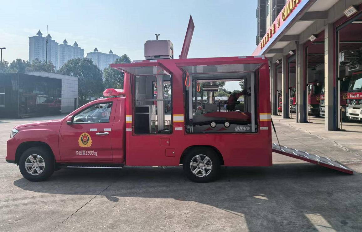 基于皮卡车改装的应急消防救援车,依托其强承载、高通过、长续航等优势,集成侦察无人机、系留照明无人机、车载侦察机器人、车载灭火机器人,面向火灾、危化品泄漏、坍塌等高危场景,兼具日常巡逻功能,实现现场侦察、全域照明、应急消防三位一体,打造空地一体、侦灭联动的移动应急消防救援体系,以智能载体赋能消防救援,避免人员风险、提升高危场景应急处置能力与救援效率。